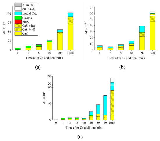 Figure 3. Evolution of area fraction (AF) of inclusions in (a) Exp. 2035, (b) Exp. 3035, and (c) Exp. 2025.