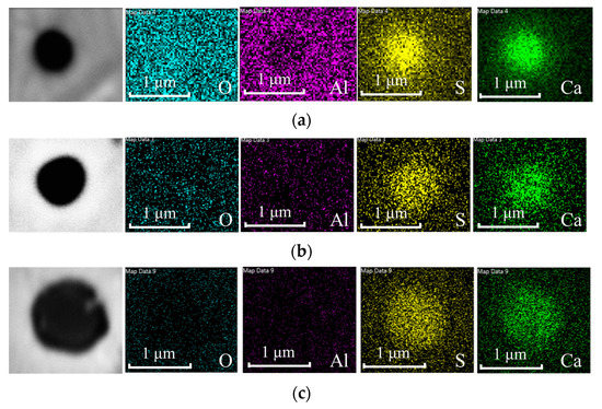 Figure 4. SEM-EDS elemental maps of CaS inclusion in (a) 1-min sample of Exp. 2035, (b) 3-min sample of Exp. 2035 and (c) 20-min sample of Exp. 3035.