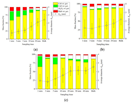 The diameter change of CaS inclusions was assumed to be neglectable after the solidification was completed. The solidus temperature was estimated to be 1773 K for all experiments using Equation (8) [33], and the estimated value was confirmed with FactSage calculation. So, with a 10 K/min cooling rate, the temperature decrease from 1873 to 1773 K was considered to be 10 min.