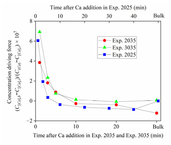 The concentration of dissolved Ca in the bulk melt was proposed to be 0.2 ppm during the industrial Ca injection process in the literature [31]. In the present study, Ca addition was conducted once in each experiment. Because of the volatile nature of Ca, the C[Ca],b was assumed to decrease from 0.2 ppm to equilibrium C[Ca],eq following Equation (7) [32] starting at 1 min after Ca addition. The values of C[Ca],eq were calculated using FactSage 7.2 based on the steel chemistries. kCa is the mass transfer coefficient of Ca in steel, which was suggested to be in the range of 2.35 × 10−4 to 3.53 × 10−4 m/s in a previous study with a similar experimental approach as the present study [32]. An average value of 2.94 × 10−4 m/s was used here. The term A V in Equation (7) is the steel-Ar interfacial area per unit volume of steel calculated based on the geometry of the crucibles.