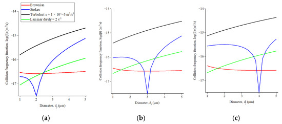 Figure 15. Comparison of collision frequency function for Brownian motion, Stokes motion, and laminar and turbulent flow for an inclusion with a diameter di of (a) 2 μm, (b) 3 μm, (c) 4 μm and varied dj.