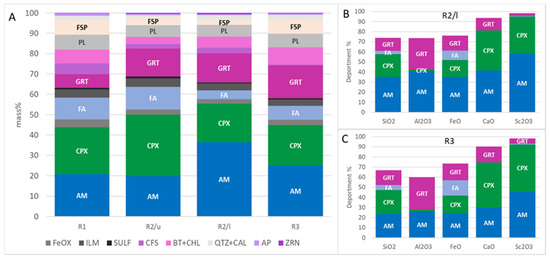 (A) Modal compositions of the concentrates used in pyrometallurgical experiments. Mineral abbreviations: AM = amphibole, CPX = clinopyroxene, FeOX = iron oxides (magnetite), FA = fayalite, ILM = ilmenite, SULF = sulfides, CFS = clinoferrosilite, GRT = garnet, BT + CHL = biotite + chlorite, PL = plagioclase, FSP = potassium feldspar, QTZ + CAL = quartz + calcite, AP = apatite, ZRN = zircon. (B,C) Deportment of SiO2, Al2O3, FeO, CaO, and Sc2O3 in amphibole, clinopyroxene, fayalite, and garnet for concentrates R2/l and R3.