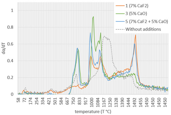 The calculation of the derivative conversion rates is explained in more detail in [9]. These rates exhibited acceleration at ~730–860 °C for samples with CaO doping, which did not appear as distinctly in the experiments with CaF2 additions only (Figure 2). As presented in Figure 2, the main reaction stage was initiated with CaF2- and/or CaO-doped R2/l samples at the same temperatures (~950 °C) as with non-doped samples, but with doping and less nonferrous gangue minerals, the reaction rates were faster with higher rates of conversion at lower temperatures. The CaO-doped samples appeared to have their main peak in the derivative conversion rates at a slightly higher temperature (a rapid increase between 970–1020 °C) than with CaF2 (950–990 °C). Furthermore, the derivative conversion rates exhibited another acceleration at ~1050–1120 °C for both types of doping at the main reduction stage, after which the rates sharply declined.