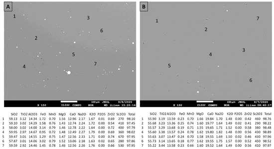 Figure 3A,B show back-scattered electron images of slag produced without any additions and with 5% addition of CaO, respectively, in experiments with R2/l concentrates at 1450 °C. The positive effect of the addition of network-transforming CaO on the reduction of the slag FeO component, as well as the separation of very small metal droplets in the slag, appeared to be obvious, with less metal retained in the slag. Figure 3A,B also present EPMA analysis points with corresponding results. The slag in both samples is visually homogeneous in back-scattered electron images but the analytical results reveal some variation, particularly in the SiO2, FeO, and Sc2O3 contents without doping (Figure 3A), which was diminished with CaO doping (Figure 3B). A summary of the slag analytical data is provided in Table 5.