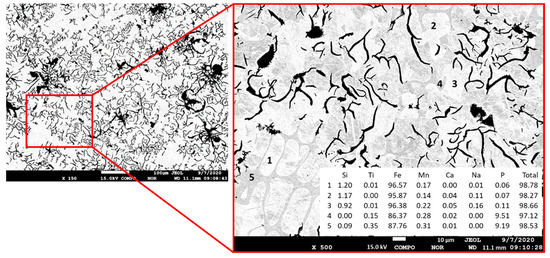 Example of large metal accumulation produced after reducing concentrate R2/l with 10% CaO addition. EPMA data on metal concentrations from points 1–5 expressed in wt%.