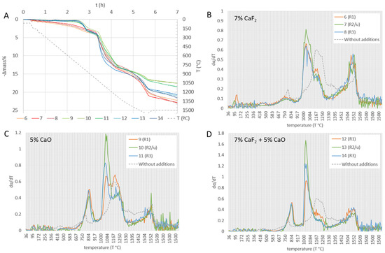 (A) Mass-loss curves for experiments 6–14, with all conducted using the same temperature program up to 1500 °C for R1, R2/u, and R3 concentrates. (B–D) Derivative conversion curves for experiments 6–8 (with 7% CaF2), 9–11 (with 5% CaO), and 12–14 (with 7% CaF2 + 5% CaO). Conversion rates for R2/l concentrate without additions shown as a reference [9].