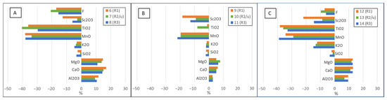 Modal compositions of the combined concentrates used in our pyrometallurgical experiments are shown in Figure 1A. Their chemical compositions, as calculated based on ICP-OES results, are reported in Table 3. Feed chemical compositions based on the modal mineralogy and EPMA analyses are also provided as a reference. This comparison allows evaluation of the reliability of the process’ mineralogical data, which are generally in agreement with the ICP-OES data. Chemical characteristics of the Kiviniemi intrusion include high Sc, Fe, Ti, and P content [2,3,4]. Despite deflecting apatite into the tailings in magnetic separation, the P2O5 grade in the concentrate remained at ~0.2–0.3 wt% (feed grade 0.6–0.74 wt%). FeO grades increased from the feed 19–23 wt% to concentrate 31–36 wt% while silica reduced from 42–47 wt% to 38–41 wt%, depending on the composite sample in question.