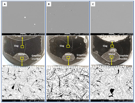 Back-scattered electron images of slag and metal after experiments with concentrate R3 conducted up to 1500 °C with various doping. (A) 7% CaF2, (B) 5% CaO, and (C) 7% CaF2 + 5% CaO additions.