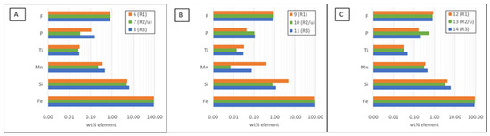 Average ferrite compositions in wt% determined by EPMA in experiments on variously doped concentrates R1, R2/u, and R3. (A) 7% CaF2, (B) 5% CaO, and (C) 7% CaF2 + 5% CaO additions.