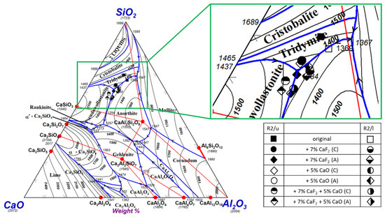 The design of the type and quantity of doping used in our experiments is based on the ternary Al2O3-CaO-SiO2 phase diagram presented in Figure 9, which exhibits the target area with lower liquidus temperatures as indicated in the close-up. To calculate and plot the compositions on the phase diagram, only the main oxide components (Table 3, Table 6 and Table S2) were considered. Slag compositions based on calculations from both ICP-OES and EPMA data are shown in comparison in Figure 9, which was computed with the FactSage version 7 and its FToxid database.