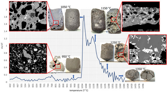 As mentioned in Kallio et al. [9], mass loss curves for such a heterogeneous system as the Kiviniemi concentrate represent a sum of interlapping and interactive phenomena originating from various reactions within and from various types of crystal structures. These include dehydration, dehydroxylation, thermal dissociation, and gas–solid reduction reactions at lower experimental temperatures, shifting with a rising temperature into melting, slag formation, and gas–liquid and solid–liquid reactions [37,38]. In addition to chemical reactions at reactant–product interfaces, diffusion and heat transfer account for the whole scenario: heat transfer from the furnace to the outer regions of the sample and into the sample, self-cooling, or self-heating of the sample during reactions, removal of evolved gaseous products, and the influence of these products on the rates of reactions all add to the scenario [39]. Despite the complexity of the phenomena, some of the main observed features at selected temperatures are presented and discussed. Figure 10 provides an overview at different temperatures, with photographs of samples and back-scattered electron images plotted on the derivative conversion curve of the baseline experiment.