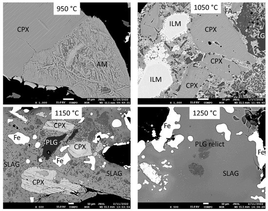 Details of mineral reactions and progression of decomposition with formation of slag and metallic iron at 950, 1050, 1150, and 1250 °C. Mineral abbreviations: CPX = clinopyroxene, AM = amphibole, ILM = ilmenite, FA = fayalite, PLG = plagioclase, Fe = metallic iron.