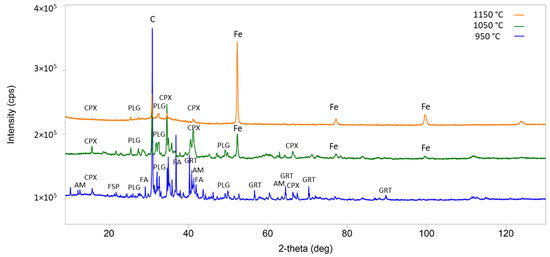 At 1150 °C, along the progression of reduction reactions, the amount of metallic iron and slag increased, with the porosity extending throughout the whole sample (Figure 10). Amorphous slag and metallic iron were the dominant phases in XRD patterns, with minor peaks still identifiable for clinopyroxene and plagioclase (Figure 12). By 1250 °C, only occasional plagioclase relicts remained in the slag, as presented in Figure 11, still with an extensive porosity, which is diminished by 1350 °C (Figure 10).