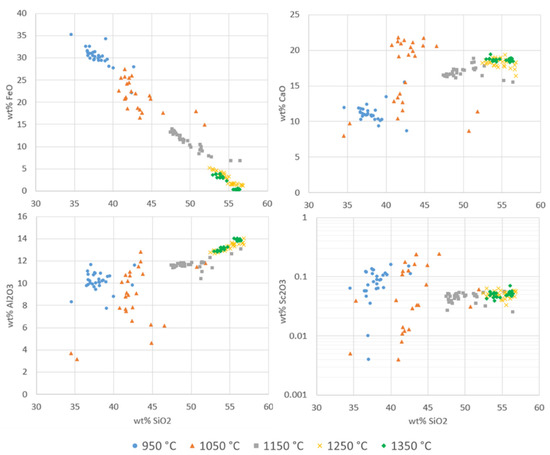 The evolution of the chemical composition of the slag phase is summarized in Figure 13, displaying binary plots of the main components and Sc2O3 vs. SiO2. The analytical results at 950 °C are for amphibole relicts, whereas at other temperatures, the compositions represent those of the slag phase. The slag phase exhibits a steady decrease in FeO due to the progression of reduction with increasing temperature. Based on these results, the slag compositions at 1050 °C with higher CaO content indicate the dissolution of added CaO into the initial slag. As the mineral reactions proceeded with increasing temperature, leading eventually to the decomposition and melting of all clinopyroxene, potassium feldspar, and plagioclase into the slag by 1250 °C, the composition of the slag became homogenized with respect to the main components, with a steady decrease in FeO.
