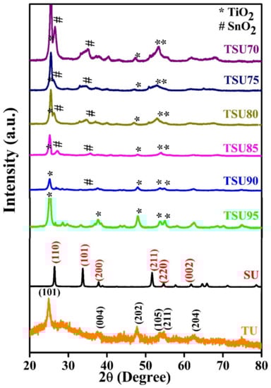 XRD patterns of pure TiO2 (TU), pure SnO2 (SU) and TiO2–SnO2 nanocomposites (TSU95, TSU90, TSU85, TSU80, TSU75 and TSU70) synthesized by combustion method.