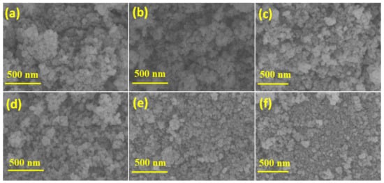 SEM images of as-synthesized TiO2–SnO2 nanocomposites (a) TSU95, (b) TSU90, (c) TSU85, (d) TSU80, (e) TSU75 and (f) TSU70.