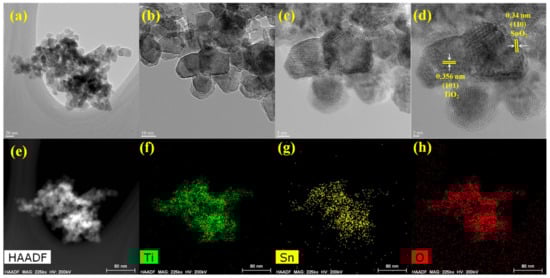 Figure 3a–d show the TEM images of the TSU80 sample recorded at different magnifications. Figure 3a shows a low-resolution TEM image of the TSU80 sample. From Figure 3b, it can be seen that the material has interconnected, porous, aggregated, and spherical NPs with sizes of 10–30 nm. Figure 3d depicts the high-resolution TEM image of the TSU80 sample. The crystallographic planes of SnO2 show the interplanar distance of 0.26 nm (101) and 0.34 nm (110), respectively. On the other hand, the interplanar distance 0.356 nm was observed for TiO2, which corresponds to the crystallographic plane (101) and is in good agreement with the XRD data. Furthermore, Figure 3e–h shows the elemental mapping that confirms the uniform distribution of Ti, Sn and O elements throughout the nanocomposite. They also show that the SnO2 nanoparticles are uniformly spread over the surface of the TiO2 nanostructure, which reveals the coupling of TiO2–SnO2. The SEM and TEM and images of the TSU80 sample reveal no separate boundary between the SnO2 and TiO2 phase because of the identical morphology and structure of the TiO2 NPs and SnO2 NPs.