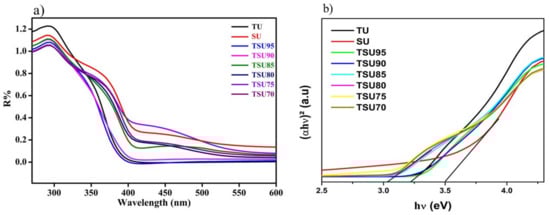 The photocatalytic activity mainly depends on the absorption of light and its wavelength. Figure 4a shows the UV-Vis diffuse reflectance spectra of the TU, SU, TSU95, TSU90, TSU85, TSU80, TSU75 and TSU70 samples. From the Figure 4a, the remarkable absorption peaks can be observed. The optimized nanocomposites of the TSU80 sample show higher absorption in terms of UV and visible regions, which may easily be due to transferring the electron from the valence band (VB) to the conduction band (CB). Band-gap energies were calculated using the following equation