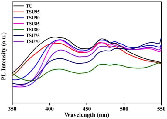 Photoluminescence (PL) spectra were acquired to gain more insights into charge-carrier separation. The PL spectra of photocatalysts (TU, TSU95, TSU90, TSU85, TSU80, TSU75 and TSU70) were measured at the excitation wavelength of 295 nm for TiO2 and TiO2–SnO2 nanocomposite at room temperature as shown in Figure 5. The PL spectra depicts the two broad emission peaks centered at 410 and 470 nm, which are attributed to band-edge emission and oxygen vacancies, respectively. When the TiO2–SnO2 heterojunction was formed, the PL intensity of the TSU80 nanocomposite was drastically reduced, indicating recombination of the charge carrier is suppressed due to interfacial charge transport from TiO2 and SnO2 was reduced. This is advantageous for the improvement of the photocatalytic performances for the degradation of methyl-orange dyes under light irradiation.