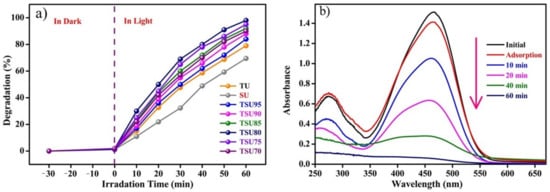 where C0 is the initial concentration and C is the final concentration of methyl orange, respectively. Figure 6a depicts the relationship between irradiation time and MO-dye degradation in the presences of UV light by different photocatalysts. The degradation activity of the as-synthesized photocatalyst for MO degradation was found to be 79.03, 69.5, 84, 88, 92, 98, 95 and 90% for TU, SU, TSU95, TSU90, TSU85, TSU80, TSU75 and TSU70, for 60 min of light irradiation. The produced TSU80 (~98%) exhibited excellent photocatalytic activity than the pure-phase TU (79.03%) and SU (69.5%) over 60 min of light irradiation. This could be attributed to the intimate interfacial connection and the heterojunction effect between the TiO2 and SnO2, which could greatly contribute to charge-carrier (electron/hole) separation and utilization. The degradation of MO was found to increase with an increase in the incorporation of SnO2; however, the excessive inclusion of SnO2 (>80) had a negative effect on the photocatalytic activity, indicating that TSU80 is an optimal catalyst. Figure 6b shows the UV-Vis-absorbance spectra for the degradation of MO dye using TSU80 catalyst.