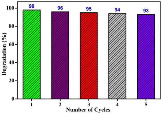 The photostability and recyclability are vital factors for a photocatalyst to be applied for commercial applications. Therefore, the stability of the as-synthesized composites was evaluated under similar conditions by collecting the photocatalyst after measurement and reuse. As shown in Figure 7, the photocatalytic activity was retained to ~90% after five successive cycles, demonstrating that these photocatalysts can be used multiple times.