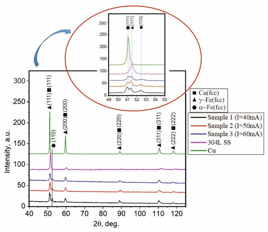 28]. Nevertheless, in all the considered cases (i.e., the welded joints and non-welded Cu plate), the peak positions of (111) Cu were in the range from 50.9659 to 51.0660. Similarly, the locations of the (111) γ-Fe peaks for all the investigated samples (i.e., the welded joints and non-welded SS plate) were from 51.3665 to 51.4666 at the 2θ scale. This very small deviation in the positions of the discussed diffraction maxima corresponded to the presence of a very small amount of residual stress. It should be noted that the existence of residual stresses, etc. are typical for welds formed by high-energy fluxes, such as electron-beam welding, due to the non-equilibrium character of such processes.