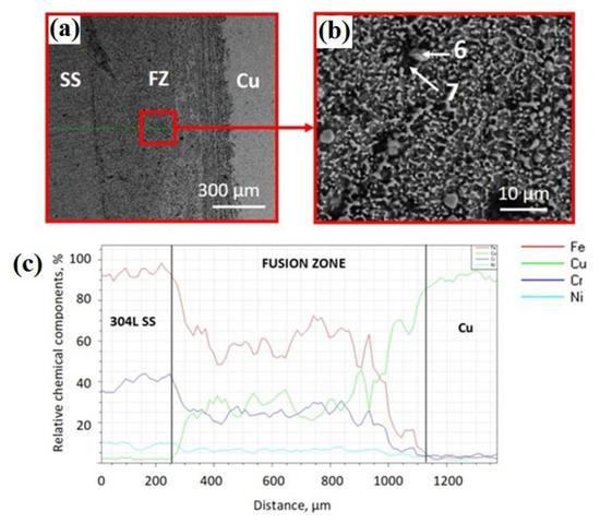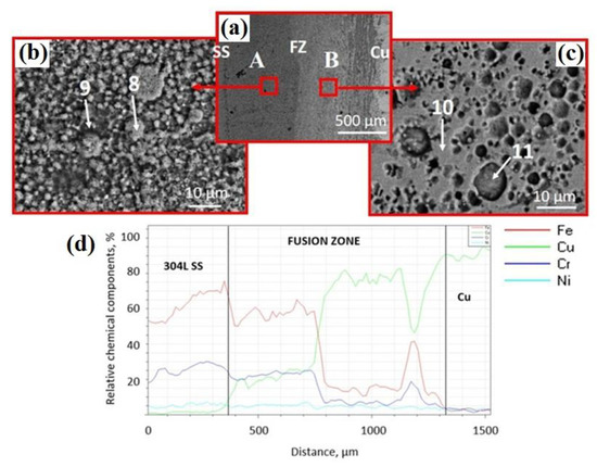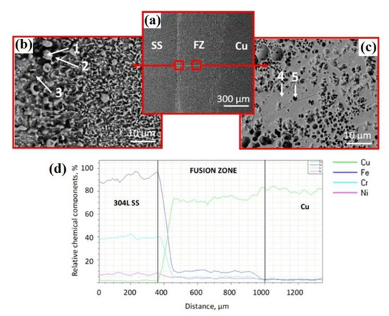 21], the microstructures of electron-beam-welded specimens of Cu and 304L SS were investigated. The technological conditions were optimized to obtain full penetration welds. The authors did not find any pores or cracks but obtained non-equilibrium copper-rich phases that may pass toward an equilibrium microstructure during service and worsen the mechanical characteristics and behaviors of the joints. Guo et al. [