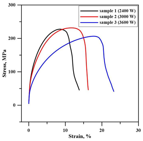35]. At the same time, elongation increases with an increase in beam power during the welding procedure. As already mentioned, higher values of beam power lead to the formation of joints with larger grain sizes. In this case, dislocations can move significantly more freely within larger grains. Obviously, how freely the dislocations can move can define the ductile properties of a material, and therefore, materials with larger grain sizes correspond to higher ductilities and greater fracture extensions. These statements are in agreement with the results obtained in the present study. It was found that the microstructure of the solid solution formed between the copper and the stainless steel was the finest in the case of electron-beam welding at a beam power of 2400 W, which corresponded to the highest measured values of the materials’ strengths. Furthermore, the elongation increased with an increases in the beam power and grain sizes of the welded joints. Moreover, the highest beam power led to a wider welded joint, which corresponded to an increase in plasticity. From another point of view, the application of 3600 W led to the highest amount of undissolved Cu as a second-phase structure, which could be another reason for the highest plasticity of the considered specimen. It is well known that Cu material is characterized as more plastic than stainless steel. An increase in the plasticity of the material leads to a reduction in the strength of the welded joint. These statements are again consistent with the results of this study; with a rise in the beam power, the elongations increased and the tensile strengths decreased.