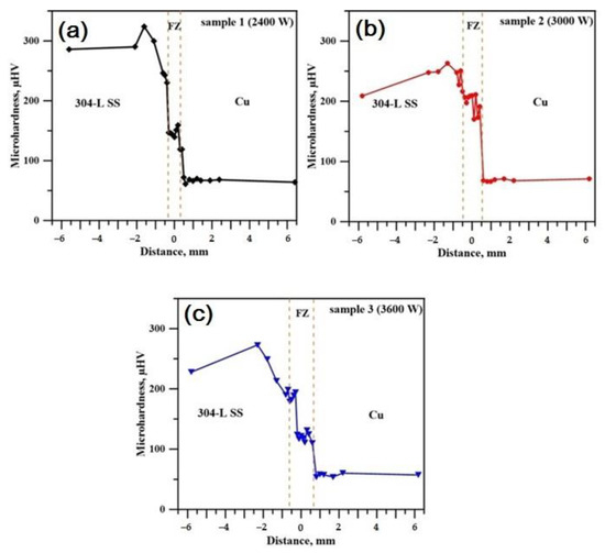 Figure 7a), one can see that the values at the interface between the welded joint and the SS part were about 250 HV and dropped to 150 HV within the fusion zone. This could be attributed to the structure of the welded joint obtained by using a beam power of 2400 W. As already mentioned, the fusion zone of this specimen consisted of a very narrow Fe–Cu solid-solution area and pure copper. The previous statement is in agreement with the results concerning the microhardness, in which a value of about 250 HV was measured at the formed solid solution and dropped to 150 HV at the Cu part of the welded joint. Considering the sample welded by using a beam power of 3000 W (i.e., Sample 2,