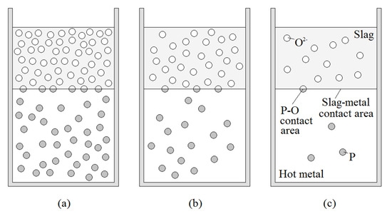 As shown in Figure 1, with the oxidation and transfer (to the slag) of phosphorus at the slag-metal interface, the content of phosphorus in the hot metal continues to decrease, so the phosphorus diffused from the hot-metal interior to the slag-metal interface will be less and less, which will directly reduce the P–O contact area at the interface. In traditional dephosphorization models, the reaction area is directly replaced by the slag-metal contact area, which is difficult to reflect the effect of the decrease in hot-metal phosphorus content on P–O contact area. Therefore, according to the restrictive conditions of the reaction, it is more reasonable to use a “dynamic relative area” which is based on the slag-metal contact area and can reflect the change in P–O contact area relative to the initial value.
