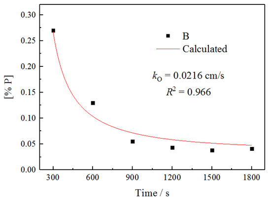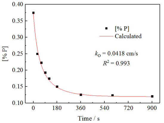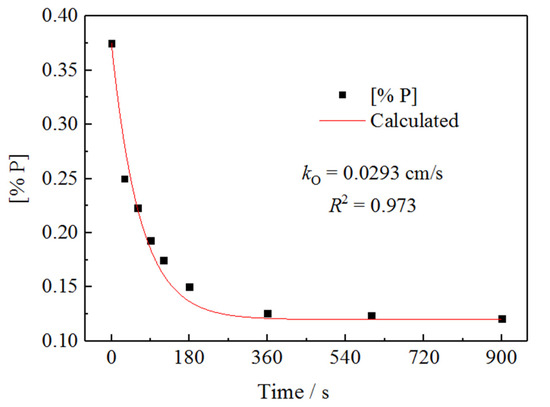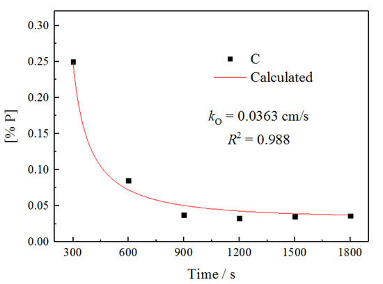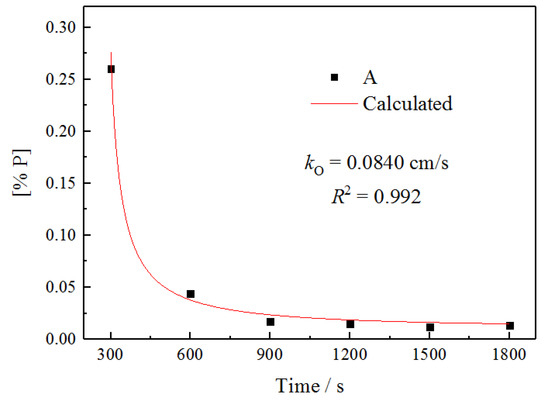 Figure 6, Figure 7 and Figure 8 demonstrate the fitting results of the new dephosphorization model to the [%P]—time data in experiments A, B, and C. Considering the interference of the dephosphorizer melting process, the new model only fits the experimental data after 300 s. As can be seen, the hot-metal phosphorus content in three experiments decreases rapidly in the first 300 s and tends to be a constant with the reaction progress, but the kO in each experiment is significantly different. According to Figure 6, Figure 7 and Figure 8, the kO of three experiments are 0.0840 cm/s, 0.0216 cm/s, and 0.0363 cm/s, respectively. The kO of A is much higher than that of B and C, indicating that the existence of Ca(OH)2 and CaCO3 is not conducive to mass transfer of phosphorus.