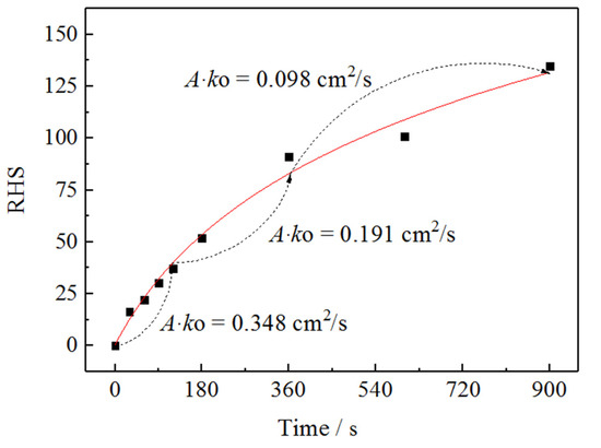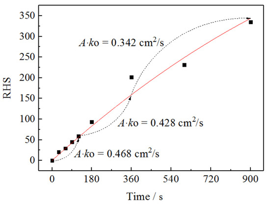 First, it is based on Mori’s RHS-time data, two models are used to calculate and fit them respectively, and Figure 4 and Figure 5 were obtained. In the figures, the RHS-time fitting curves are divided into three stages (0 to 120 s, 120 to 360 s, 360 to 900 s), and the average values of A·kO in each stage are marked.