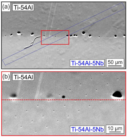(a) Indentation field (blue) across the interface of the Nb-containing diffusion couple between Ti-54Al and Ti-54Al-5Nb aged at 1200 °C for 500 h. The area marked with a red rectangle is shown in (b) at a higher magnification with the interface indicated by the dashed line.