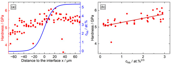 A great advantage of the diffusion couple approach is that with the same samples, diffusion and solid solution hardening coefficient can be determined. In Figure 3a, the hardness and the fitted Nb-concentration are plotted across the interface of the Nb-containing diffusion couple aged at 1200 °C for 500 h. It is clearly visible that with an increasing alloying content, the hardness increases as well. This is in good agreement with the literature on the effect of Nb on the γ-phase [30,31]. Figure 3b shows the hardness as a function of the Nb-content in the interdiffusion zone according to the Labusch model. According to Equation (1) the slope of the line in Figure 3b corresponds to the solid solution hardening coefficient Ki with the exponent a being 2/3 after the Labusch model [21]. ΔH is the hardness difference between the alloyed and the unalloyed γ-TiAl phase and ci the concentration of the alloying element.