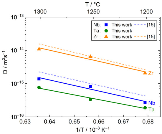 Arrhenius-plot of the average interdiffusion coefficients D of Nb, Ta and Zr determined in this work, compared with literature data from Herzig et al. (reproduced from Ref. [15]), in a temperature range of 1200–1300 °C.