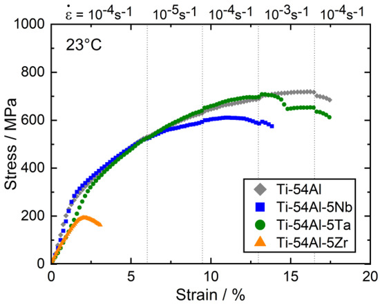 For the evaluation of the mechanical properties of the pure γ-phase Ti-54Al-5X alloys, strain rate jump tests at room temperature and elevated temperatures were performed in compression at room temperature. The stress strain curves of the four alloys at room temperature are shown in Figure 5. At this testing temperature all investigated alloys showed brittle failure. While Ti-54Al, Ti-54Al-5Nb and Ti-54Al-5Ta exhibit failure strains between 13% and 17%, the brittle behavior is significantly more pronounced for the Ti-54Al-5Zr alloy, which fails at only 3% strain. This coincides with results from Kawabata et al. [35], who observed a significantly reduced fracture strain with increasing Zr additions. This reduced fracture strain of Ti-54Al-5Zr also leads to a strongly decreased strength. The stress strain curves of Ti-54Al-5Nb and Ti-54Al-5Ta at room temperature show no overall beneficial effect of Nb or Ta additions compared to Ti-54Al.