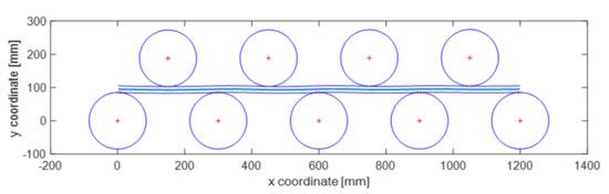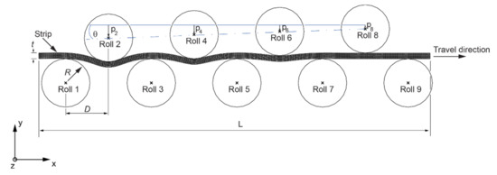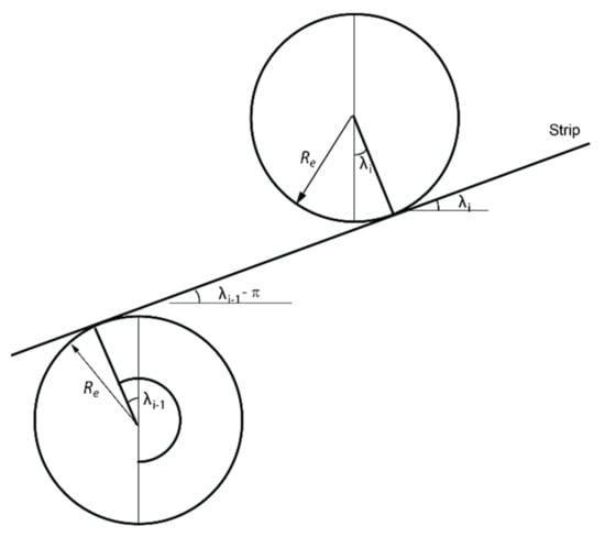 Contact points between the strip and the rolls can be computed iteratively assuming that only one contact point between the roll and the strip exists [5,10]. Behrens et al. [6] and Dratz et al. [7] adopted the common tangent contact condition to develop their roller leveling model. The single point contact and common tangent contact assumptions render a simple means to model the contact between the strip and rolls. A line contact between the strip and each roll is assumed in the initial modeling work here. In the two-dimensional model considered in this investigation, the strip contacts with each roll tangentially as shown in Figure 3. The expanded radius of the roll [] is given as