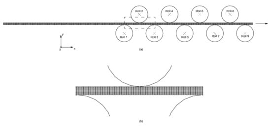 (a) A finite element model. (b) A close-up view of the mesh near a roll.