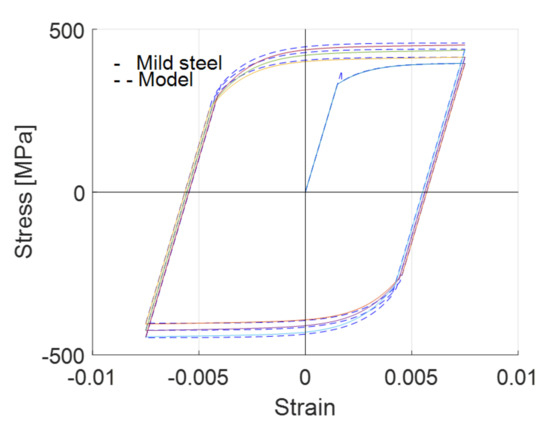 Finite element analyses are carried out to verify the accuracy of the analytical model. The material properties for the mild steel used in the finite element analyses are listed in Table 1. The isotropic hardening parameters, and , and the kinematic hardening parameters, and , are calibrated from the uniaxial, symmetric strain-controlled, cyclic test with the strain range of 0.015 as shown in Figure 6. The calibration procedure is described in Section 3.