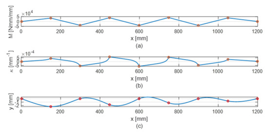 A recursive scheme is adopted to calculate the curvature, bending moment, deflected curve of the strip, and the contact points. Initially, the location of the contact points and the curvature of the strip curve at the th contact point are assumed. The bending moment at the th contact point is computed using Equations (1)–(6). Based on the assumption of a linear distribution of the moment between the contact points, the curvature of the deflected strip curve is estimated. Using the curvature distribution , the deflected strip curve [m] is calculated by