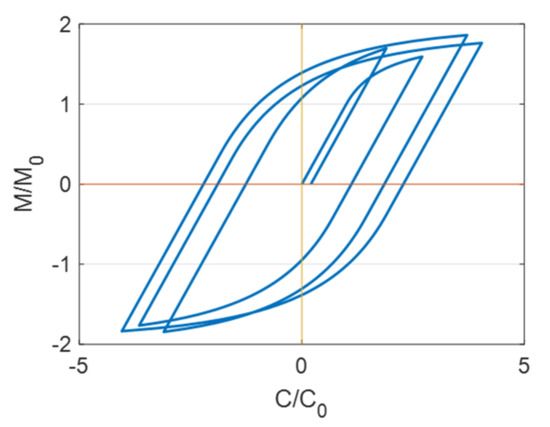 Figure 6 shows the stress–strain curves of a mild steel under a uniaxial, symmetric strain-controlled, cyclic test. The strain range is 0.015. Based on the first half of the stress–strain curve of the first cycle, the calibrated values of the Young’s modulus and the initial yield stress are 219.8 GPa and 329.7 MPa, respectively, and and have values of 66.3 MPa and 742.7, respectively. The values of and are calibrated as 128.3 MPa and 604.7, respectively, based on the second half of the stress–strain curve of the first cycle.