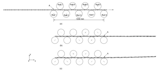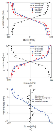 The stress distributions of the cross-section A at rolls 2–4, rolls 5–7, and rolls 8–9 based on the finite element analyses are shown in Figure 11a–c, respectively. The results based on the finite element analyses (FEA) are plotted with the markers in the figure. As shown in the figure, the analytical results agree with the results of finite element analyses. The discrepancy can be attributed to different contact conditions between the analytical model and the finite element model. Multiple contact points between the strip and each roll are observed in the finite element model. However, a single contact point between the strip and each roll is assumed in the analytical model.