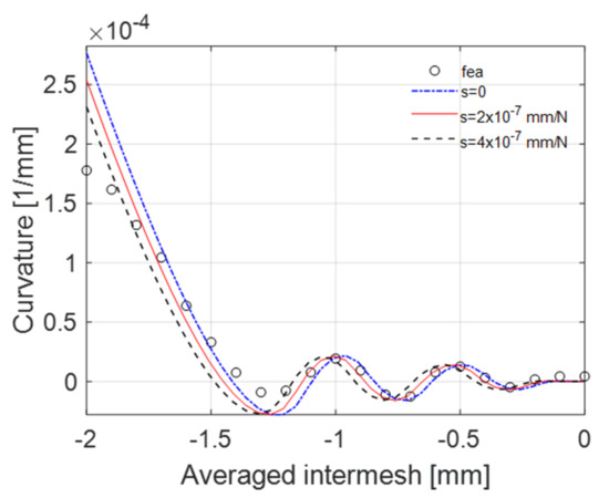 The residual curvatures of the strip calculated by the analytical model with the Hertz contact compliance are plotted in Figure 13. The curves with the compliance = 0 and mm/N appear to envelop the results based on the finite element analyses. The curve with the compliance = mm/N may be able to predict the general trend of the results based on the finite element analyses for the averaged intermesh ranging from 0 mm to −2 mm. The wrap-around contact condition between the strip and the rolls can be manifested by the analytical model with the Hertz contact compliance within an acceptable accuracy, compared with the results of the finite element analyses.