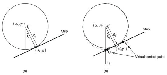 In the analytical model, a point contact is assumed between the strip and each roll, which means the strip does not wind around the work rolls. This contradicts with the fact that multi-point contact between the strip and the roll predicted in the finite element analyses. Morris et al. [3] reported that the wrap angle near the exit roll has a significant influence on the flatness of the strip. Wrap-around contact length between the strip and the roll may depend on the intermesh and roll spacing. In describing the arc of contact of the strip around a roll, an effective radius can be assumed to model the wrap-around contact characteristics. The concept of the effective radius is illustrated schematically in Figure 14. Figure 14a shows the original contact model, where the strip contacts with roll tangentially. is the expanded radius of the roll, which is defined by Equation (7). (,) is the th contact point, and is the th contact angle. Figure 14b shows that the strip makes contact elastically with roll when subjected to an external force . The circumferences of the deformed roll and the original roll are represented by the solid line and the dashed line, respectively, in Figure 14b. (,) is the th contact point, and is the th contact angle for the Hertz contact model. A local deformation is ensued to cause a reduction in the local radius of roll . The effective radius of the roll is given as