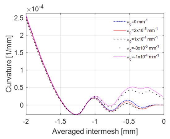 A series of simulations was run to calculate the residual curvatures of the strip with an initial curvature based on the analytical model with the Hertz contact compliance = mm/N. The initial stress in the strip is neglected without losing generality of the residual curvature predictions. Mathieu et al. [29] considered initial flatness defects in their finite element analyses of a leveling process. They introduced the flatness defects in the strip which was free of stress. Figure 15 shows the residual curvature as a function of the averaged intermesh for the strip with the initial curvature varying between to . As shown in Figure 15, at low levels of roll intermesh (averaged intermeshes greater than −0.1), the residual curvatures for the three cases of = , , and deviate from each other significantly. For the averaged intermesh in this level, the curve for the case of = oscillates mostly in the positive-curvature region ( > 0), in contrast to the cases of = and , which oscillate between the positive region and the negative region. The initially bowed-down defect for the strip with = exits the leveler with the residual curvature in the same direction for the averaged intermesh greater than −0.71. As the extent of the averaged intermesh increases, the residual curvatures for the three cases of = , , and gradually converge to the same values. For the values of the averaged intermesh less than −1.1, the curves for the three cases appear identical, where two cross over points with the interpolated averaged intermesh values of −1.46 and −1.13 were found. For the values of the averaged intermesh less than −1.46, positive residual curvatures were produced. For the averaged intermesh values within the interval of −1.46, −1.13, the minimum of the residual curvature is . In this region of the leveler settings, the residual curvatures of the strip seem to be insensitive to its initial curvatures. This result can serve to the advantage of leveler operators to obtain nearly zero residual curvature for strips with various initial curvatures. Grüber et al. [18] also demonstrated robustness of the roll intermesh settings for a roller leveler regarding a change in the initial curvature. In this investigation, the plane strain condition is considered in the finite element analyses. The width-to-thickness ratio of the strip considered in the analyses is 5. Carvalho et al. [30] reported that, in order to develop near plain strain conditions, it is important to maintain a ratio of width-to-thickness greater than 5.