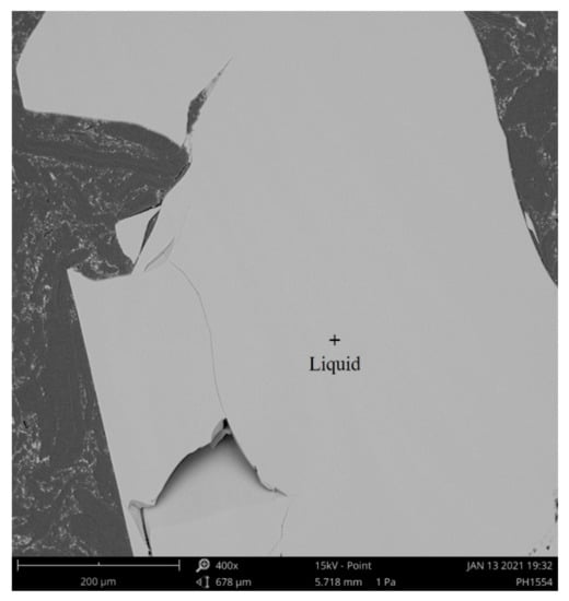 First, CaO, SiO2, La2O3 and Nb2O5 reagents (provided by the Sinopharm Chemical Regent Co., Ltd. Beijing, China.) with a purity of 99.99% were calcined at 1000 °C for 4 h to evaporate moisture and impurity. Then, according to the designed compositions of slags, the reagents with a total weight of 10 g were weighted by an electronic balance with an accuracy of 0.1 mg, sufficiently mixed in a platinum crucible and pre-melted in MoSi2 furnace (B type-thermocouple, temperature control accuracy: ±1 °C, temperature measurement accuracy: ±1 °C). The furnace was heated to 1600 °C with a speed of 3.3 °C/min and kept for 9 h to completely homogenize the slags. Finally, the resulting slags were quenched in ice water within 2 s. The above experimental procedures were all carried out in air atmosphere. After the experiment, the slags were analyzed by scanning electron microscope and energy dispersive spectrometer (SEM-EDS), and at least 6 points were analyzed for each phase in each slag. The details of SEM were EHT = 20 kV and I probe = 200 pA. The standard samples for EDS were O(SiO2), Si(SiO2), Ca(Wollastonite), Nb (Nb) and La (LaB6).The accuracy of EDS was within 1%. Figure 1 shows the SEM photo of pre-melted slag 1, which shows homogeneous liquid phase, indicating that the pre-melted slags were completely melted. The compositions of the pre-melted slags were determined according to the EDS results, as shown in Table 1, which were considered to be the initial compositions of slags.