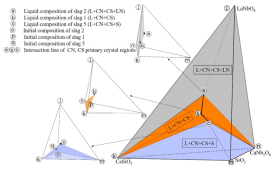 Based on the above geometric relations in phase diagram, the intersection line of CN, CS primary crystal regions under current experiment condition was determined as shown in Figure 4 (curve ⓐ–ⓒ), where ⓐ and ⓑ are two endpoints of the intersection line, respectively. It can be concluded that three equilibrium phase regions exist in CaO-SiO2-La2O3-Nb2O5 system at 1200 °C in reducing atmosphere, which are L+CN+CS+LN (ⓐⓚⓝⓙ tetrahedron region in Figure 4), L+CN+CS+S (ⓒⓚⓜⓝ tetrahedron region in Figure 4), L+CN+CS (ⓐⓑⓒⓚⓝ region in Figure 4).