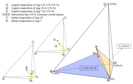 The equilibrium phases of slag 5 are L+CN+CS+S, the equilibrium phases of slag 10 and slag 7 are both L+CN+S. Combining the liquid phase compositions of slag 5, slag 10, slag 7 with the Gibbs phase rule, the intersection line of CN, S primary crystal regions was constructed in spatial phase diagram as shown in Figure 5 (curve ⓒ–ⓔ), where the ⓒ–ⓔ points represent the liquid phase compositions of slag 5, slag 10 and slag 7, the ⓡ, ⓢ points represent the initial compositions of slag 10, slag 7, respectively. It is observed that the experiment results conform to the lever rule, which also proves that the experimental slags had reached the thermodynamic equilibrium state. It can be concluded that two equilibrium phase regions exist in CaO-SiO2-La2O3-Nb2O5 system at 1200 °C in reducing atmosphere, which are L+CN+CS+S (ⓒⓚⓜⓝ tetrahedron region in Figure 5) and L+CN+S (ⓒⓓⓔⓜⓝ region in Figure 5).