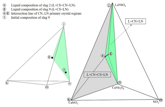 The equilibrium phases of slag 2, slag 3 and slag 4 are all L+CN+CS+LN, the equilibrium phases of slag 9 are L+CN+LN. Combining the liquid phase compositions of the above slags with the Gibbs phase rule, the intersection line of CN, LN primary crystal regions was constructed in spatial phase diagram as shown in Figure 6 (line ⓐⓖ), where the ⓐ, ⓖ points represent the liquid phase compositions of slag 2, slag 9 and the ⓣ point represents the initial composition of slag 9, respectively. It can be seen that the experiment results of slag 9 conform to the lever rule, which also explains the slag 9 had reached the thermodynamic equilibrium condition. Thus, two equilibrium phase regions were determined in CaO-SiO2-La2O3-Nb2O5 system at 1200 °C in reducing atmosphere, which are L+CN+CS+LN (ⓐⓚⓝⓙ tetrahedron region in Figure 6) and L+CN+LN (ⓐⓖⓝⓙ tetrahedron region in Figure 6).