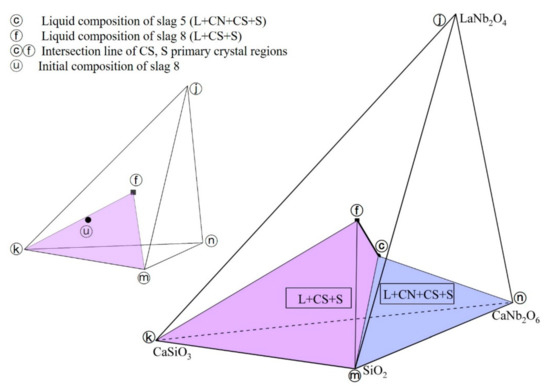 The equilibrium phases of slag 5, slag 8 are L+CN+CS+S and L+CS+S, respectively. Combining the liquid phase compositions of the slag 5 and slag 8 with the Gibbs phase rule, the intersection line of CS, S primary crystal regions was constructed in spatial phase diagram as shown in Figure 7 (line ⓒⓕ), where the ⓒ, ⓕ points represent the liquid phase compositions of slag 5, slag 8, respectively, and the ⓤ point represents the initial composition of slag 8. It is obvious that the experiment results of slag 8 conform to the lever rule as well, which illustrates slag 8 had reached the thermodynamic equilibrium state. Thus, two equilibrium phase regions exist in CaO-SiO2-La2O3-Nb2O5 system at 1200 °C in reducing atmosphere, which are L+CN+CS+S (ⓒⓚⓜⓝ tetrahedron region in Figure 7) and L+CS+S (ⓕⓚⓜⓒ tetrahedron region in Figure 7).
